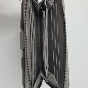 Badgley Mischka logo continental quilted wallet in the color gray. Features: zip closure, multiple card slots, and interior zip pocket for cash/coins. In good condition - it does have a few scuff marks on the back of the wallet and a small pen mark in the interior near the logo. Please see the pictures.
