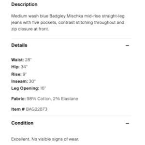 Mid rise, medium blue, copper toned embroidered logo Badgley Mischka straight leg jeans. Fabric is 98% Cotton, 2% Elastane. Worn size tag. Women's size XS, US 0. Measurements: Waist: 28" Hip: 34" Rise: 9" Inseam: 30" Leg Opening: 16"