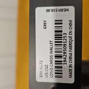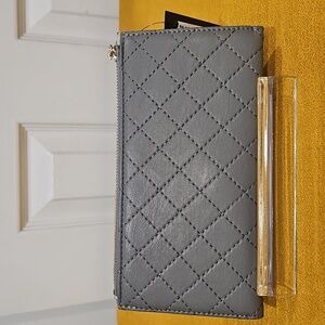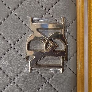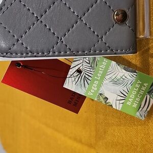 Beautiful wallet by Badgley Mischka, gray gold lettering lots of around for your cards and your money and your drivers license have to run out of the house to the gas station. Your wallet is a beautiful addition to a purse. Very soft vegan leather. Very nice wallet.