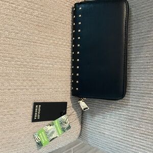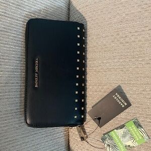 Beautiful Badgley Mischka Long Black Vegan Leather wallet with Gold Lettering Logo and Gold studs.