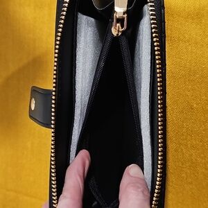 This NWT Badgley Mischka wallet is a stylish addition to any wardrobe. The black vegan leather wallet features a quilted pattern and a zip-around closure. It comes with a phone pocket and a wristlet, making it perfect for on-the-go use. The wallet is accented with a zipper and the Badgley Mischka logo. It has enough space for credit cards and other essentials.