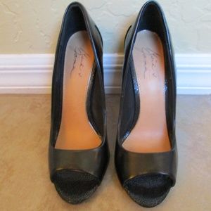Badgley Mischka Mark And James Black Leather Heels Women Size 8.5 M 39. The black leather uppers are super clean no deep scuffs or scratches in the finish. The insoles are also very clean and do not show any wear. The soles are clean and only show some light and very even wear. Please see all pictures. From a non smoking home. I sell a lot of items. I try very hard to describe all items correctly, I guarantee that you will be happy with the Item.
