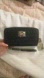 Badgley Mischka black vegan leather diamond quilted monogrammed Harlequin embroidered long wallet phone holder clutch. Features an ≈8" long detachable wristlet with a 360° turning lobster clasp.