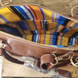 Step into a world of timeless elegance with this Badgley Mischka tote, where rich brown leather meets sophisticated gold accents. The monogram design whispers luxury, while the spacious interior ensures practicality. Carry your essentials in style, whether you're heading to a meeting or a casual outing.
