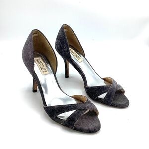 Step in style with these amazing BM sandals in an eye-catching gold pewter color! Neiman Marcus Badgley Mischka Luxury Glitter Accent Sandals. Silver Gray color. Size 6M. Heel height approx. 2.9 inches. Great pre-owned condition, light signs of cosmetic wear, no structural issues - see photos