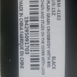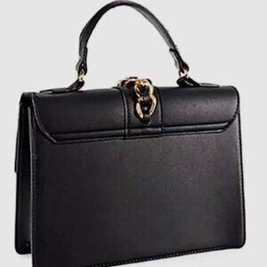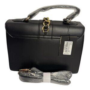 This is a new Badgley Mischka crossbody bag in black color. It has a turn lock closure and a detachable strap. The bag is made of vegan leather and has a lining also made of vegan leather. It has a medium size with a width of 10 inches, a height of 8 1/4 inches, and a depth of 6 1/2 inches. The exterior has gold and black hardware.