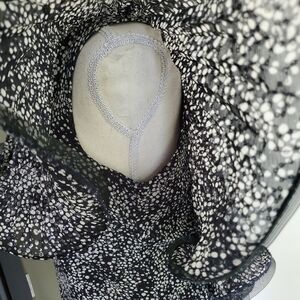 Badgley Mischka navy and white silk top with sequins and all-around flouncy mesh exaggerated ruffle detail with pleats, low back and zipper that goes top to bottom (does not unzip all the way - stops at the top seam).