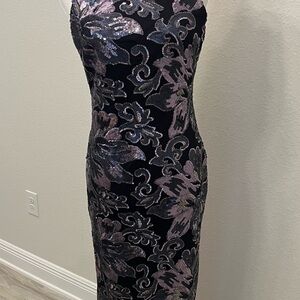 Chic dark navy sleeveless maxi dress with floral sequins.Stunning!!! Great preowned condition. Coming from a smoke free and pet free home. Measurements are available upon request. My mannequin is Size 4-6. The dress is a definite 4!