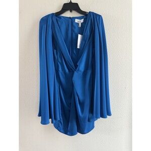 Belle by Badgley Mischka Nora Satin V-Neck Long Bell Sleeve Twist Front Mini Dress Blue Cobalt $268.