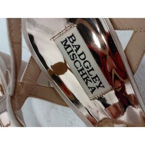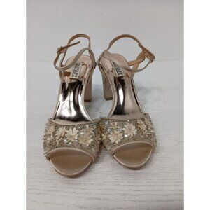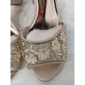 Chic nude heels with floral details. Features block heel and ankle strap. Ideal for elegant events.