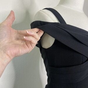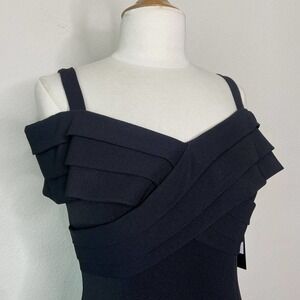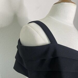 Gorgeous dress by Badgley Mischka new with tags originally $330. Black dress with a cold shoulder/off the shoulder/shoulder strap hybrid design. Pleated off the shoulder detail that continues to criss cross over chest and ending at waist. Ribbed texture. Fully lined. Stunning, quality little black dress! All measurements are approximate, taken flat and closed.