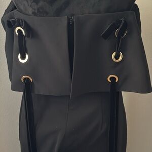 Badgley Mischka crepe evening gown. Lace-up back with velvet ties. Off-the shoulder neckline. Popover bodice. Short sleeves. Trumpet silhouette. Hidden back zip.