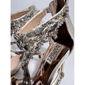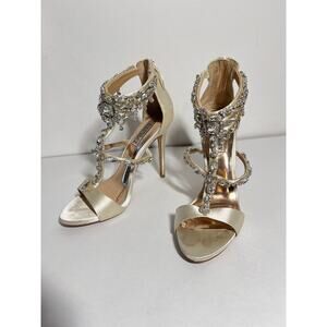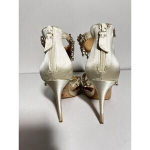 You are bidding on a pair of heels from Badgley Mischka, size 7 US, off-white satin, good used condition. 4.5" heel, back zipper. There are some scuffs, all stones are in place. All sales are final so please email with questions.
