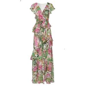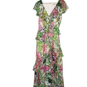 Badgley Mischka Palm Print Ruffle Pink Green Maxi Dress size 4