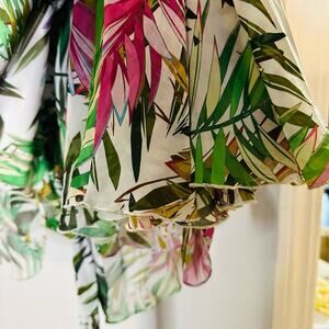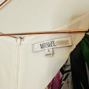 The Badgley Mischka Palm Print Ruffle Pink Green Maxi Dress Size 4 is a stunning and elegant dress that is perfect for any special occasion. The dress features a flattering V-neckline, ruffled sleeves, and a flowing maxi skirt. The palm print design is both feminine and sophisticated, and the pink and green color combination is both fresh and flattering.