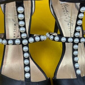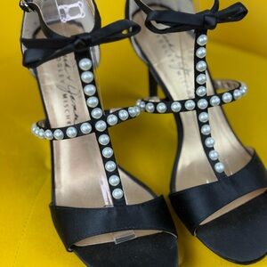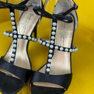 Badgley Mischka Pearl Studded T Strap Black Satin Pumps Sz 8M
