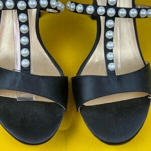 Step out in style with these elegant black sandals, featuring stunning pearl embellishments. Perfect for any occasion, these shoes offer both comfort and sophistication.shoe are in good condition.