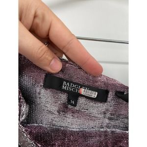 Your go-to party pants for the season, these wide-leg Badgley Mischka pants ensure you'll stand out in metallic pink style. Size: 14 Color: Pink/Silver Metallic Cotton, acetate, polyester, lurex Hidden front zipper closure Front pockets Belted paperbag tie waist Excellent condition