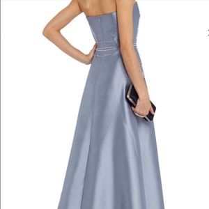 Ice blue. Satin-twill. Gorgeous hand-beaded detail flowing from mid-bodice to below the waistline. Back zip. Authentic Badgely Mischka gown. Never worn. New with tags and documentation of provenance and purchase. Still in the box in which it was shipped to me, which I never opened. I bought this gown to wear to a military ball that I ultimately wasn't able to attend. Asking price is almost 50% of original purchase price. Simply an elegant, uniquely beautiful and timelessly sexy gown.