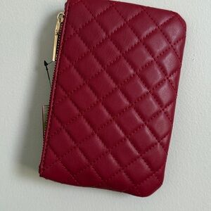 Stylish red quilted wristlet with a gold logo. Perfect for carrying essentials. NWT
