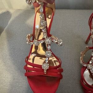 Badgley Mischka Red Satin Crystal Stiletto Heels