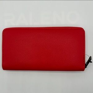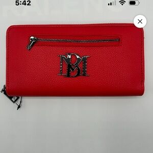 Stylish red wallet with silver logo. Features a front zipper pocket.