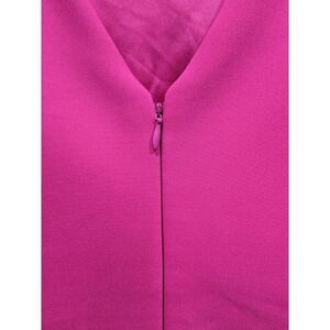 Retro 50's inspired sleeveless a-line dress with a crew neck and V back in a vibrant pink with an orange hem accented by a black stripe. Fully lined. Zipper and hook & eye closure.