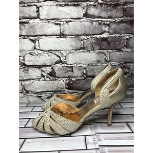 Selling Badgley Mischka Rhinestone Embellished Gray Shimmer Peep Toe Pump Heels Women sz 9.5M US/40EU