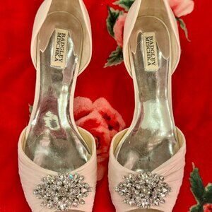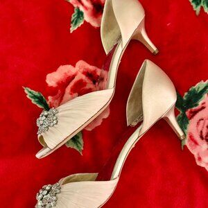 Add a touch of glamour to your look with these Badgley Mischka “Sabine” heels. Crafted in soft light pink satin with a dazzling crystal brooch detail, these shoes are perfect for weddings, bridesmaids, or any elegant occasion.
