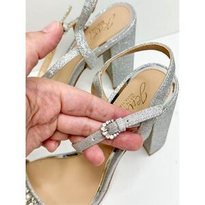 Badgley Mischka Sandals Womens Size 8.5 Silver Block Heel Open Toe Embellished