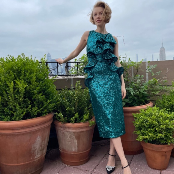 As captivating as the waves of the deep blue sea, this ruffled teal masterpiece has an air of magic about it. Shimmer your way into your next cocktail party in this look.