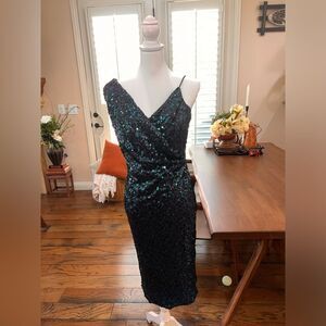 Badgley Mischka Sequin Cocktail Dress Sz 6 Teal Blue V-Neck Sleeveless Party