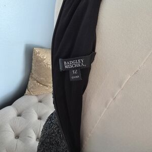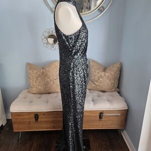 Stunning Badgley Mischka dress with shimmering green sequins. This dress has an asymmetrical halter neckline and curve-defining ruching, perfect for any evening out.