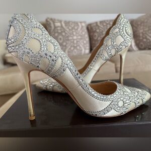 Elegant silver heels with sparkling embellishments. Perfect for special occasions. Only wore once on wedding day. A few imperfections on the toe of the shoe and some stains on the stem of the heel. All beading and jewels are in tact. Box also comes with a kit if any jewels do fall out.