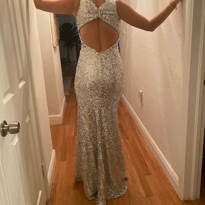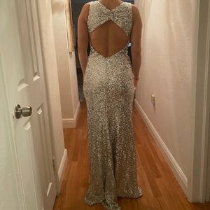 Beautiful Show Stopping Mermaid Gown. Fits like a glove. It has some stains on it from my spray tan that the dry cleaning wasn't able to take off (see pictures). I Just dry cleaned it recently and the bottom part has some stain since it reaches the floor and has a little train. Im 5'9" and I had 4 inch heels on. She's looking for a new home to party it up at a wedding or gala :) Guaranteed to have a good time and SHINE :)