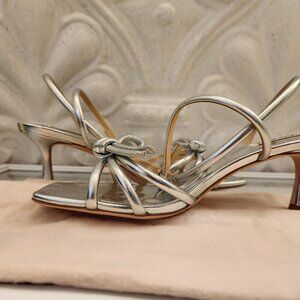 Badgley Mischka Silver Leather " Loyalty Knot" Sandals. NIB. Size Various. The size 8.5 sold. I have a size 6.5 in the same box/condition. No rips/stains/scuffs/tears/peeling. NIB/original box/packaging with dust bag. May have been tried on, I see scant dirt markings on the bottoms, not really dirt, just a bit of discoloration in my opinion. Smoke free home. No odors. All offers are welcome. Thank you!