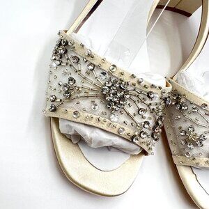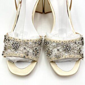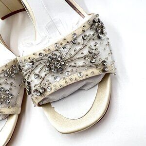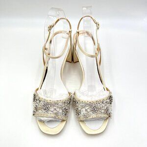 Badgley Mischka Size 10 Jeweled Ivory Satin Block Heels Dress Sandals Shoes