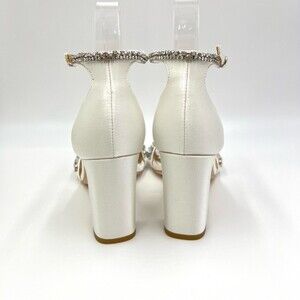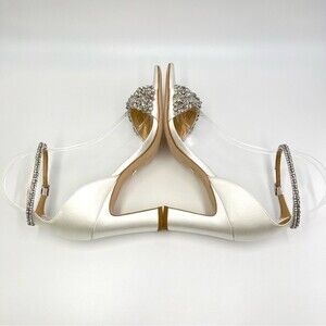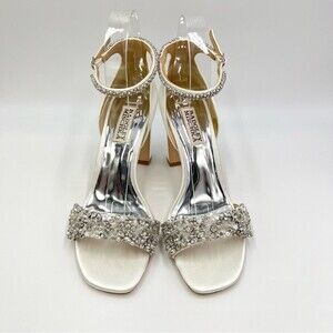 Badgley Mischka women's Kendall white satin floral jewel / rhinestone embellished dress sandals / heels. Colorway is Soft White. Women's size 6.5.