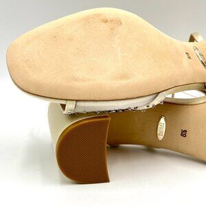 party special event evening dress up formal elegant wedding bridal bride bridesmaid prom pageant satin shoes flats heels pumps strappy gold silver shimmery sparkly sparkle glitter glittery bling jewel jewels jeweled rhinestone rhinestones crystal crystals bhldn gems ankle strap open toe low block kitten stiletto heel christmas metallic shiny pageant bhldn pearls embellished embellishments new years holiday womens women's size 8.5 spring summer winter fall autumn season