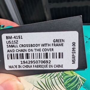 NWT Badgley Mischka small crossbody with frame and chain on cover. Very pretty green. Chain strap is removable for a clutch. Size is approx 8 x 5 x 2. Still pretty roomy. Will hold a smart phone. Has slots for cards and a front pocket. Brand new.