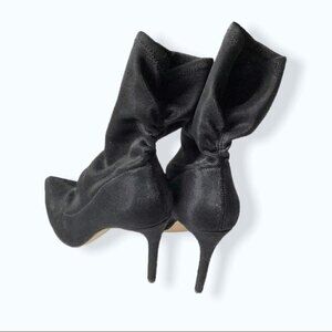 Badgley Mischka Jewel black thick fabric Ronny evening shimmer pointed toe sock boots. Shirred back seam. Stiletto 3.5” heel. Subtle summer fabric. Great preloved condition with minimal wear.