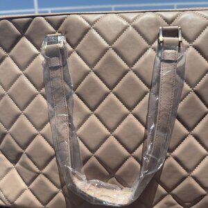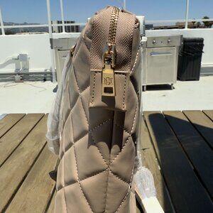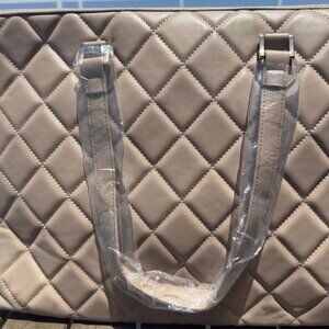 Badgley Mischka studded tote bag in a tan taupe color with gold-tone hardware, double handles, and a crossbody strap. It has a zipper closure and a small interior zip pocket.