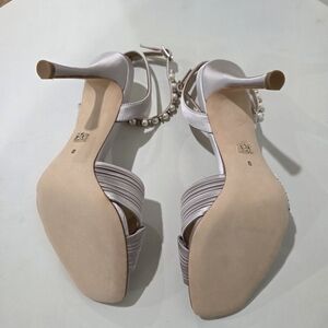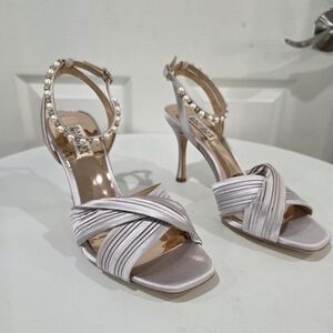 The pleated satin crossover vamp is the highlight of this piece. Pearls detail the ankle strap creating an air of serenity and luxury.