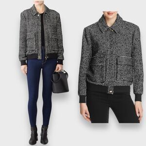 For sale is this Badgley Mischka Tweed Knit Bomber Moto Jacket Size Large Full Zip Black White. This jacket is in good condition and features two front sealed pockets, contrast ribbed-knit trims, concealed front zip with snap storm placket, and is fully lined.