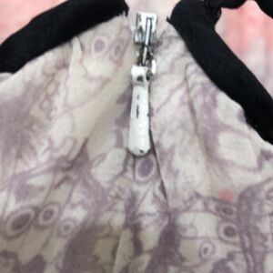 Good condition no stains rips or fading. Some slight chipping of the paint on the zipper pull. Some barely visible dinginess on the hem. Sleeveless, spaghetti strap, v-neck, fit and flare full length gown. Zips in back. No slits. No padding. Cream with black, gray, dusty purple and pastel pink butterflies.