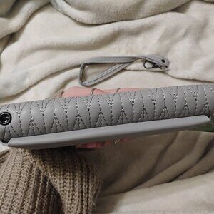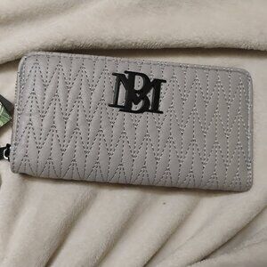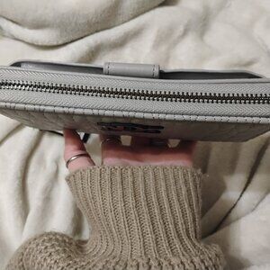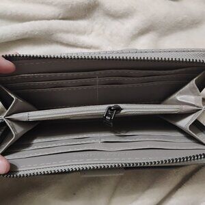 Beautiful and versatile wallet with detachable wristlet strap. Grey with gunmetal hardware. phone pouch on back. multi card slots inside with center zipper.