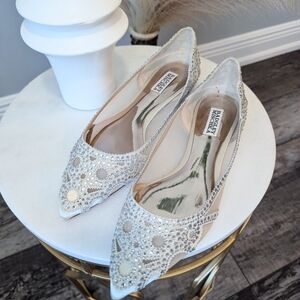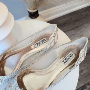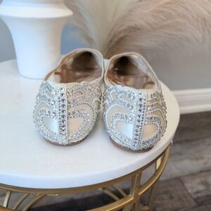 These stunning ivory flats by Badgley Mischka are adorned with intricate crystal embellishments, creating a luxurious and shimmering effect. The pointed toe design and refined material make them an ideal choice for formal occasions, adding a touch of elegance to any ensemble. Perfect Cinderella wedding shoes. size 9. excellent condition. has mark on bottom. sell all photos.