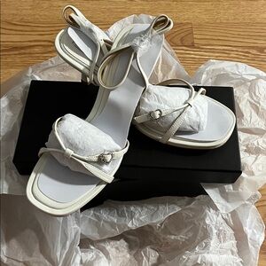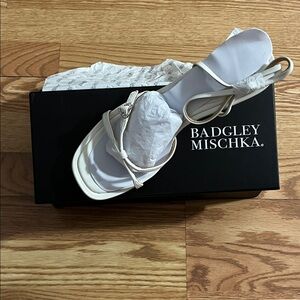 NEW IN BOX Badgley Mischka Elegant white leather sandals. Features a heart-shaped buckle. Perfect for any occasion.