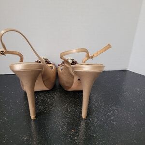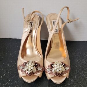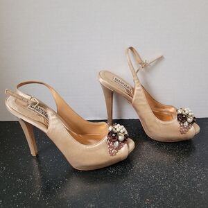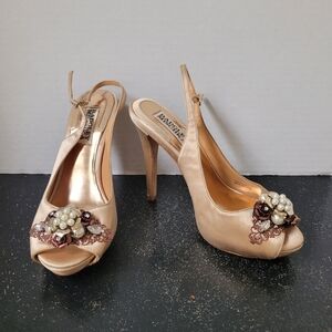 Elegant gold peep-toe heels by Badgley Mischka, featuring a stunning floral embellishment. Perfect for adding a touch of glamour to any outfit.