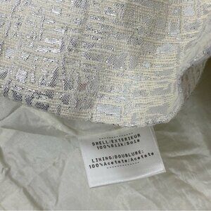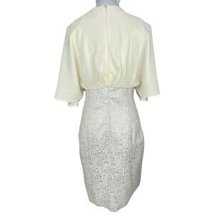 Badgley Mischka Collection women’s size 10 dress, this stunning party dress has short flutter sleeves, v-neckline, an attached belted waistline, lined, ivory and silver metallic color, with back zip closure. Materials shell 100% silk, lining 100% acetate. Care dry clean. Condition is preloved good, faint stains on the back of the right shoulder as shown in pictures. Please preview the measurements to ensure fit.